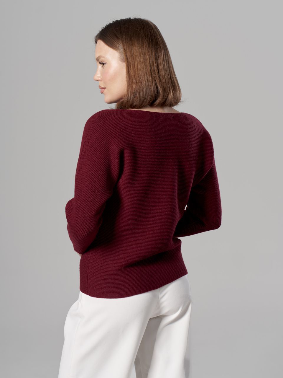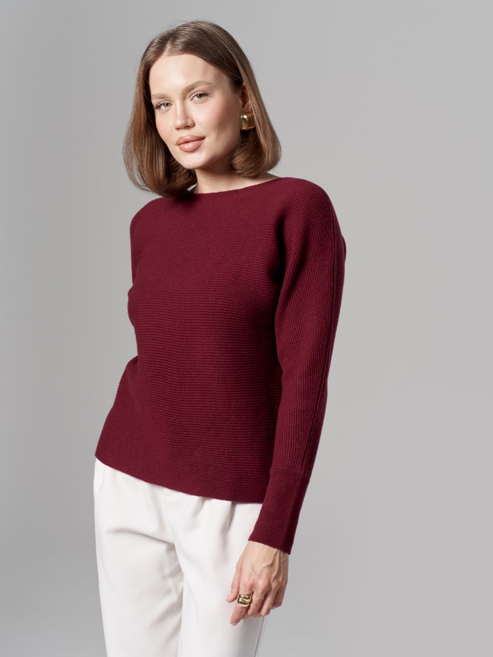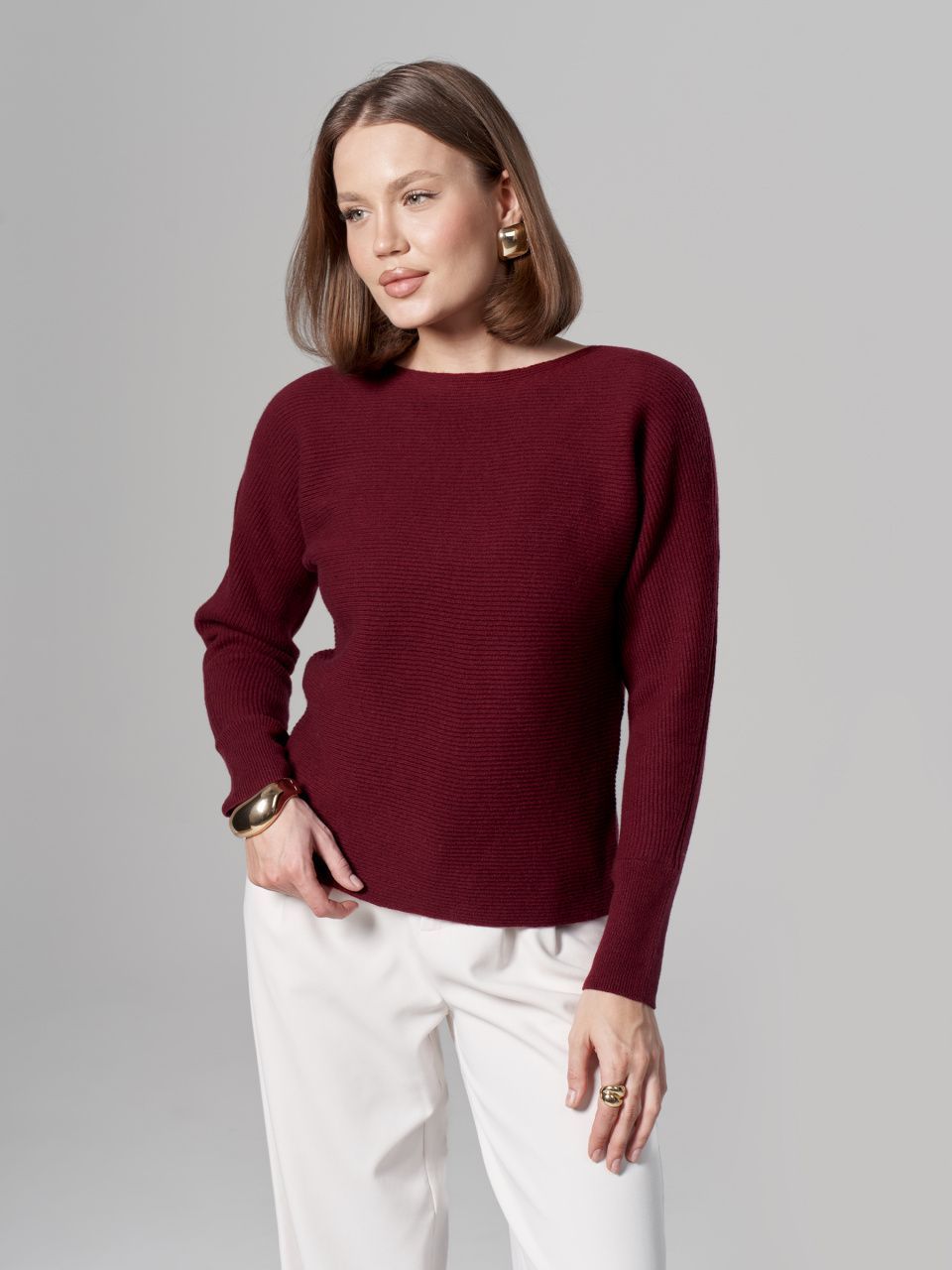 Джемпер в горизонтальный рубчик из шерсти мериноса кардного качества.