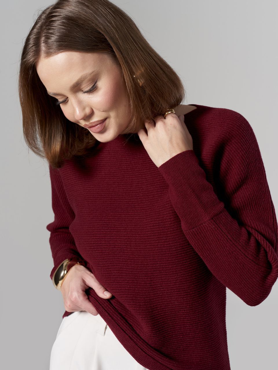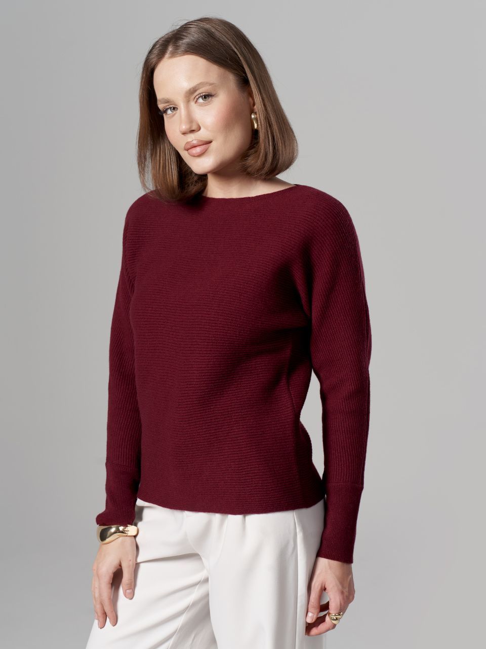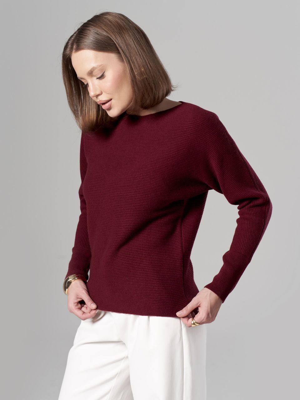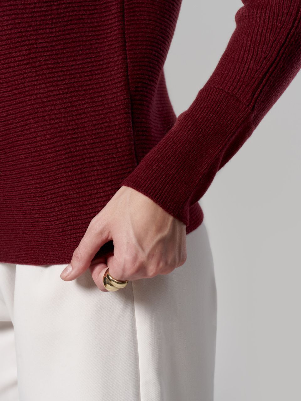 Джемпер в горизонтальный рубчик из шерсти мериноса кардного качества.