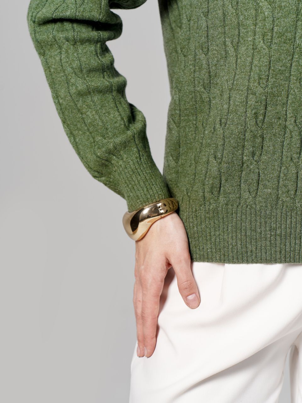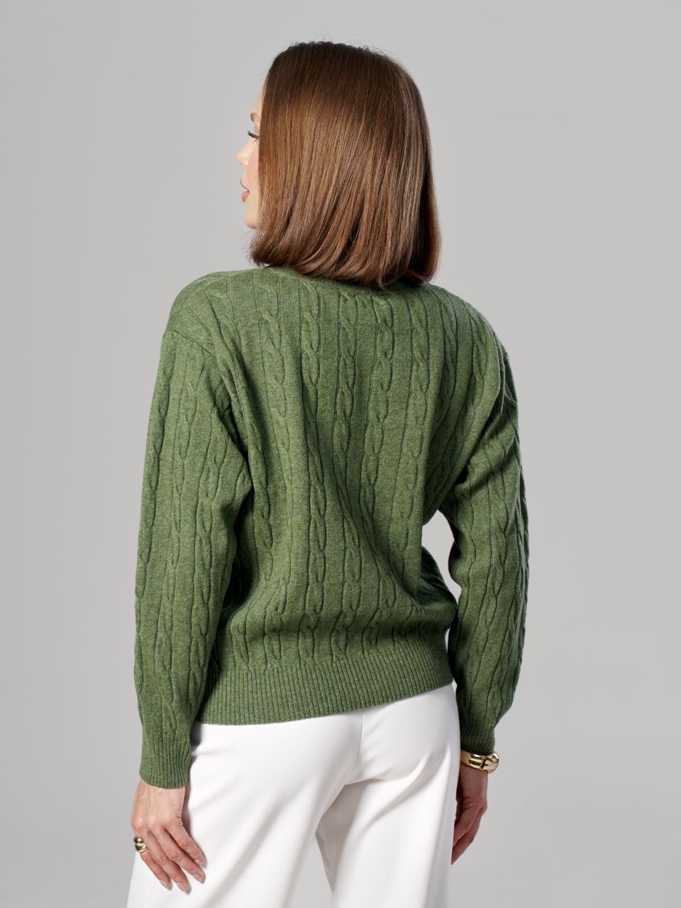 Этот джемпер выполнен из 100% шерсти мериноса, которая великолепно удерживает тепло и обладает особой мягкостью. Фактурный узор «косы» придает модели объем и выразительность, делая её идеальным выбором как для уютных повседневных образов, так и для элегантного офисного стиля.